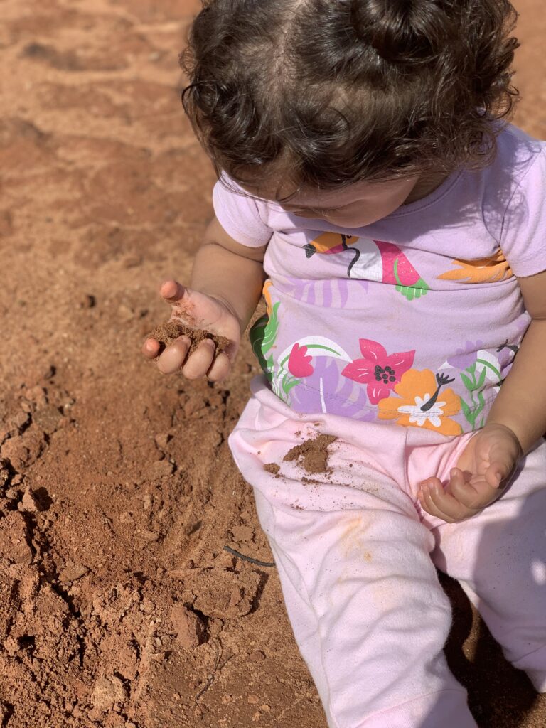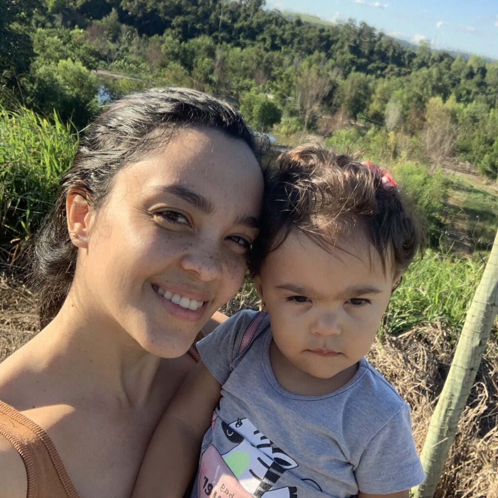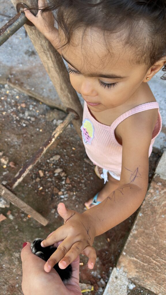 Uma das minhas melhores alegrias é poder ver minha filha, desde pequena, interagindo com as galinhas, vacas, bezerros, cavalos e outros animais desde sempre, desde pequena.