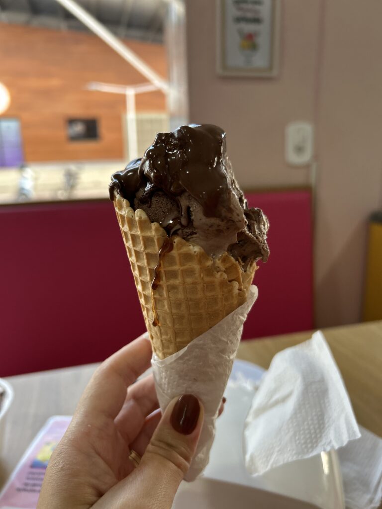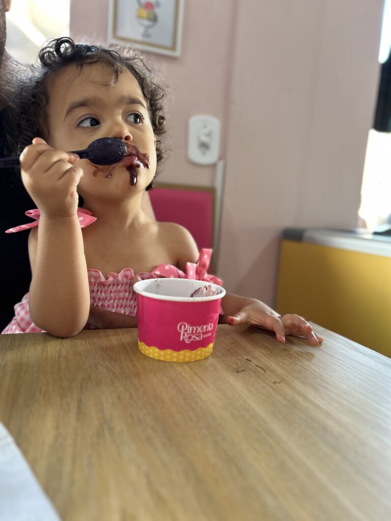 No dia seguinte, sorveteria com bebê e marido. 4 bolas de sorvete no copinho e mais 5 no cascão. Limites? Nunca tive kkkkkkk saí de lá flutuando e rindo atoa.
